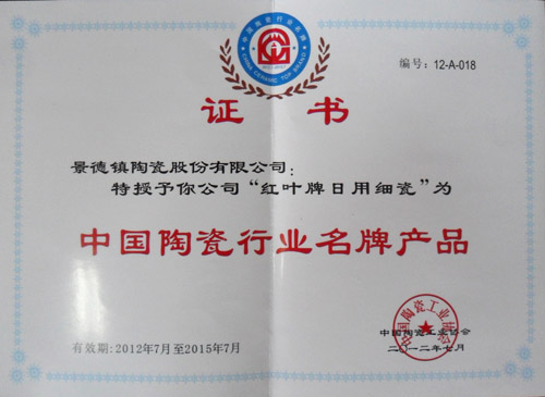 中國(guó)陶瓷工業(yè)協(xié)會(huì)于今年2月份開展了第五批中國(guó)陶瓷行業(yè)名牌產(chǎn)品的推薦評(píng)審及復(fù)評(píng)工作。經(jīng)過企業(yè)自愿申請(qǐng)、資料審查、專家評(píng)審、組委會(huì)領(lǐng)導(dǎo)小組審查、公示等一系列細(xì)致的工作,最終評(píng)選出了2012年“中國(guó)陶瓷行業(yè)名牌產(chǎn)品”。公司生產(chǎn)的“紅葉”牌日用陶瓷再次被評(píng)為“中國(guó)陶瓷行業(yè)名牌產(chǎn)品”。
