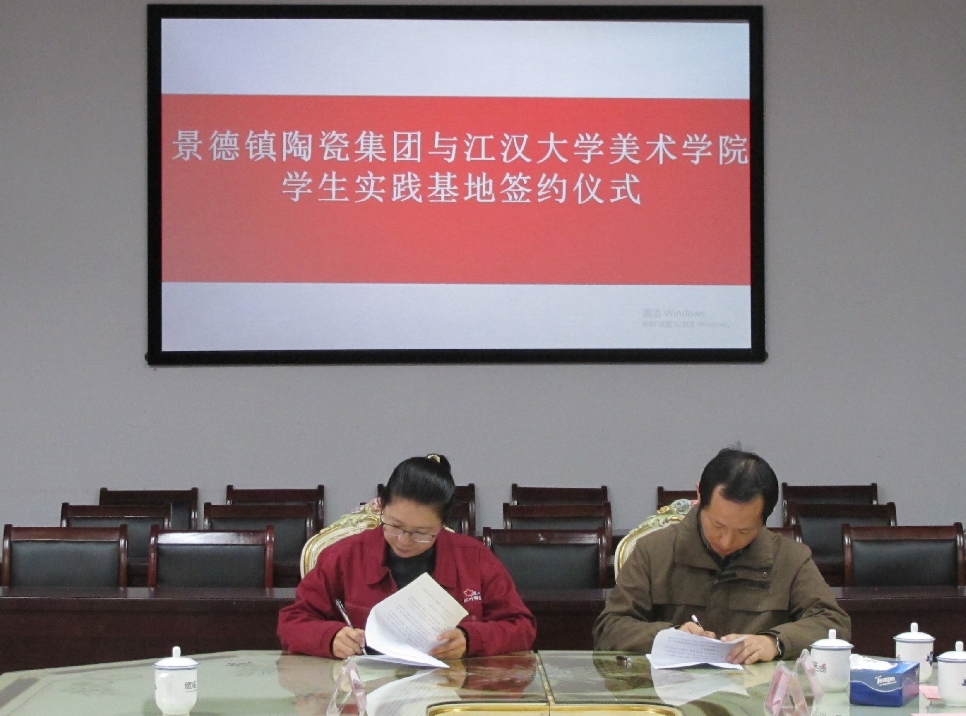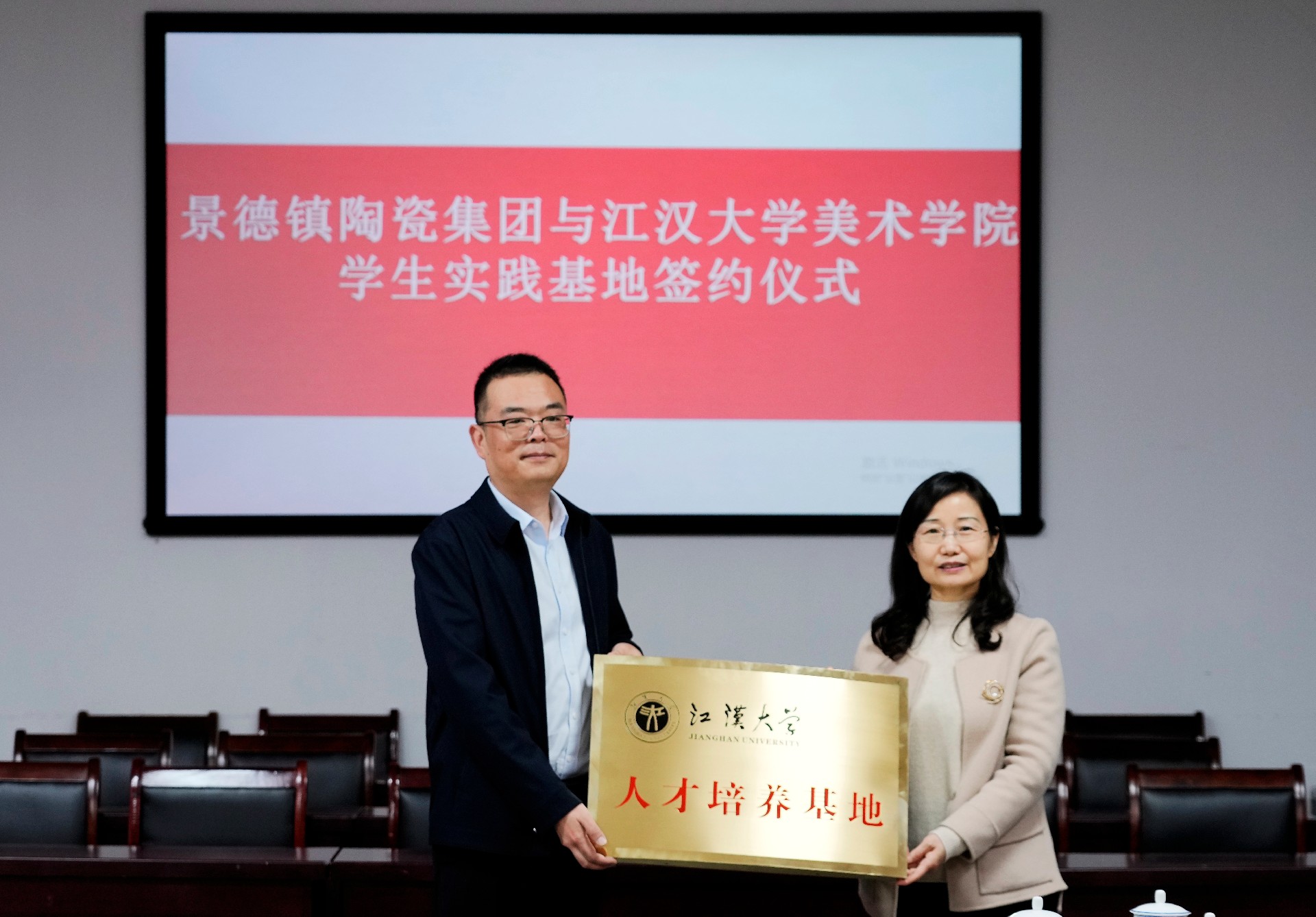 會上,舉行了江漢大學(xué)美術(shù)學(xué)院與景陶集團(tuán)“共建學(xué)生實(shí)踐基地”簽約授牌儀式。集團(tuán)人力資源部部長薛景玉、江漢大學(xué)美術(shù)學(xué)院副院長馬杰分別代表雙方初步簽訂了《校外實(shí)習(xí)基地建設(shè)協(xié)議書》,江漢大學(xué)美術(shù)學(xué)院副書記楊緒軍代表江大美院捐贈《江漢大學(xué)美術(shù)學(xué)院畢業(yè)作品集》等書籍。