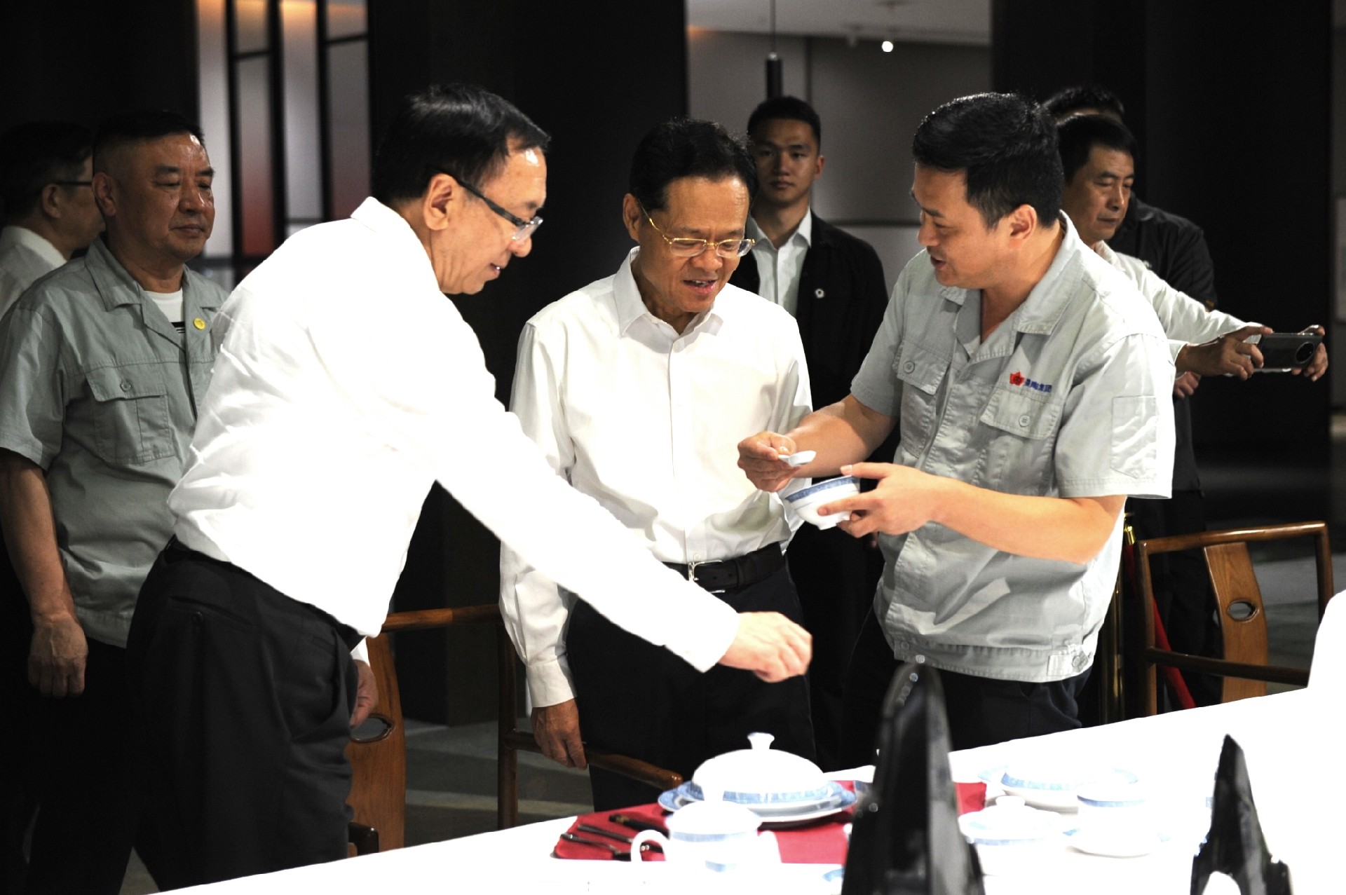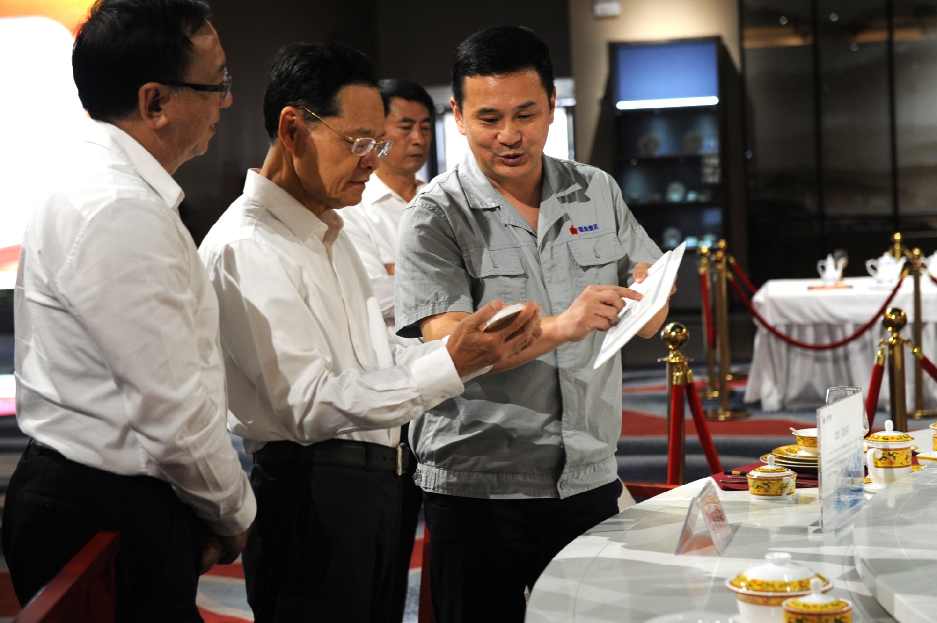 在國(guó)瓷館展廳,鄧景揚(yáng)向陳武介紹了紅葉陶瓷產(chǎn)品特色和先進(jìn)制瓷工藝,重點(diǎn)講述了一系列“國(guó)瓷”“國(guó)禮”故事。陳武對(duì)精美的產(chǎn)品給予高度評(píng)價(jià)。
